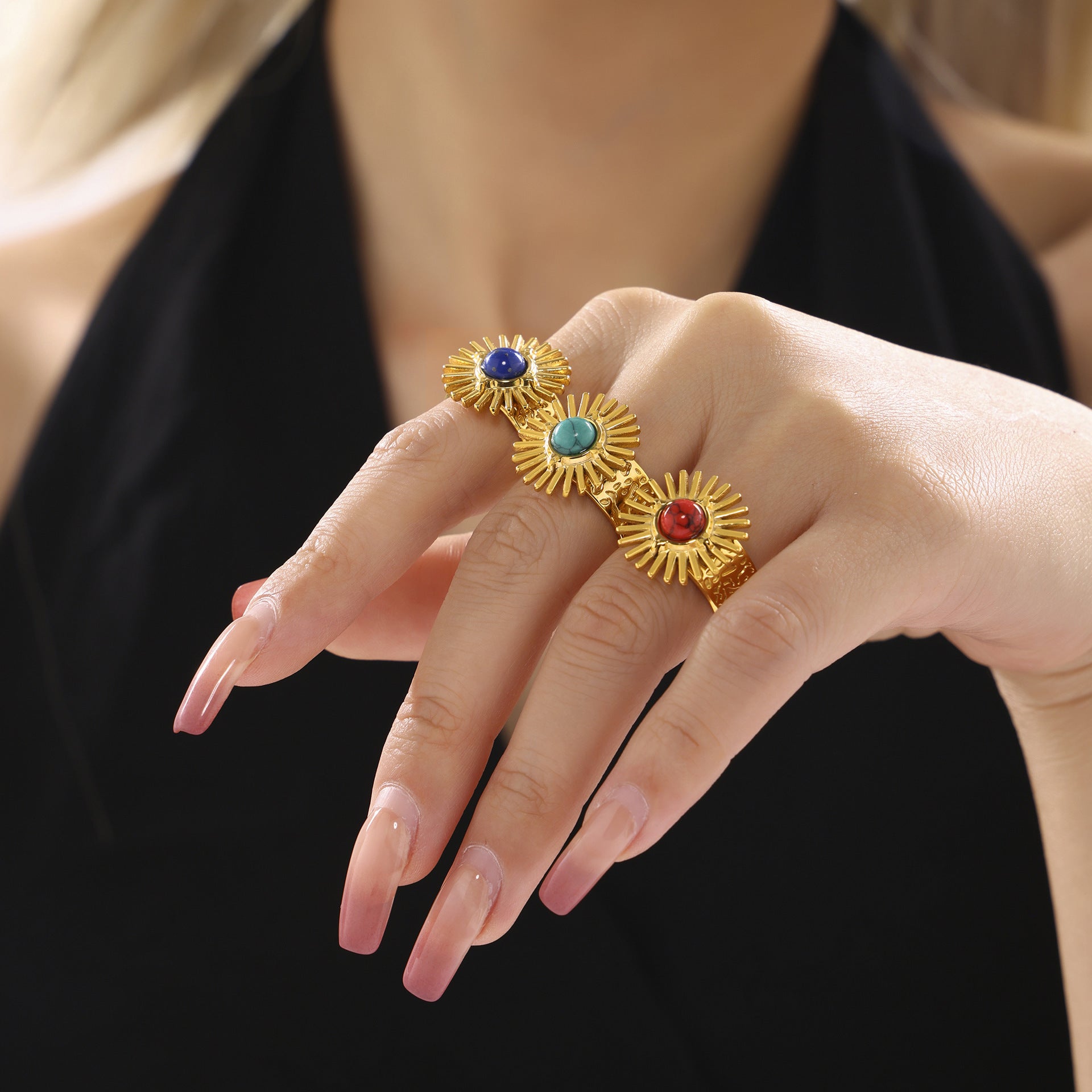 Elevate your style with the Geometric Petal Stainless Steel Ring, a versatile accessory designed for women who love modern elegance. Crafted from durable stainless steel with premium electroplating, this ring is available in stunning color options: gold pink turquoise, gold black turquoise, gold dark green river stone, gold red turquoise, and gold lapis lazuli.
